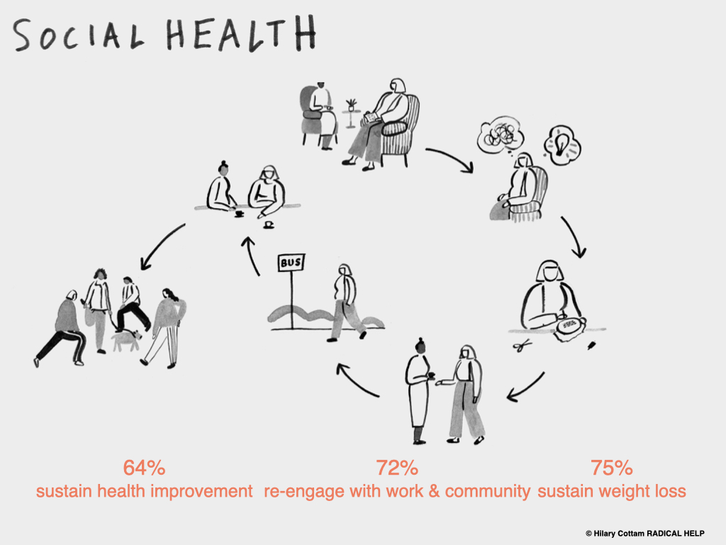 These new models are always less costly (although that is not their purpose – flourishing is their purpose and savings are a by-product). Many of them come from parts of the world where relationships are strong but resources are scarce. Another example is the community health work in Westminster started by the GP Cornelia Junghans.